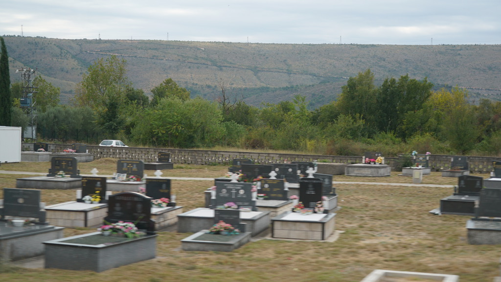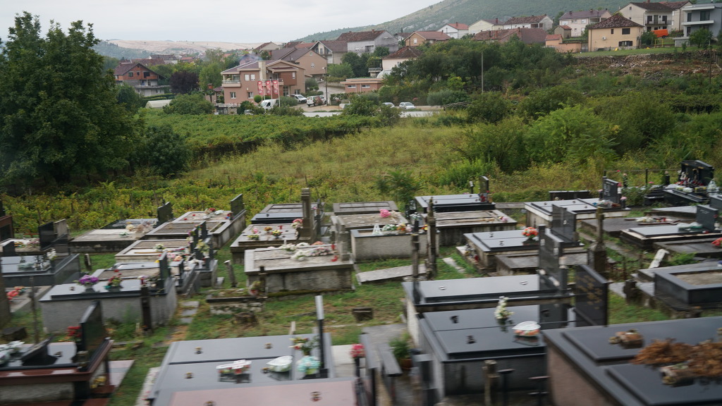 보스니아의 모스타르로 가는 길의 유고내전으로 희생된 사람들의 무덤