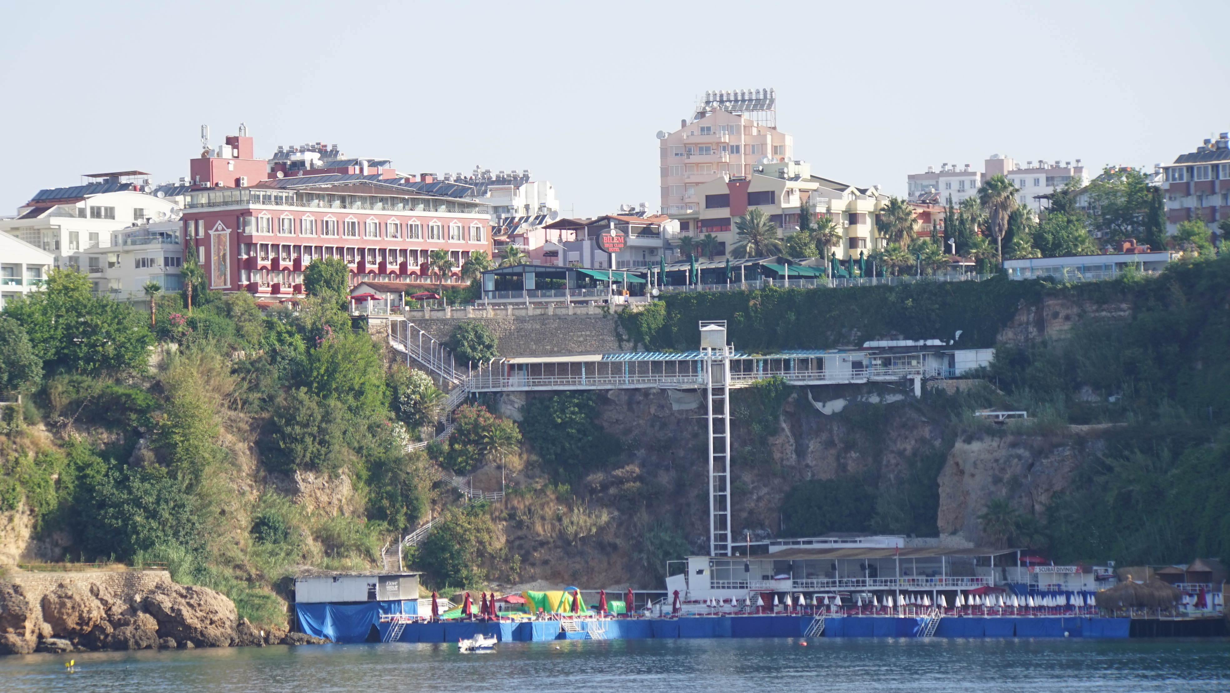 안탈리아 해변은 바다에 침식을 당해서 절벽으로 이루어져 있는데 밖이 보이는 엘리베이터를 타고 해변으로 내려간다.