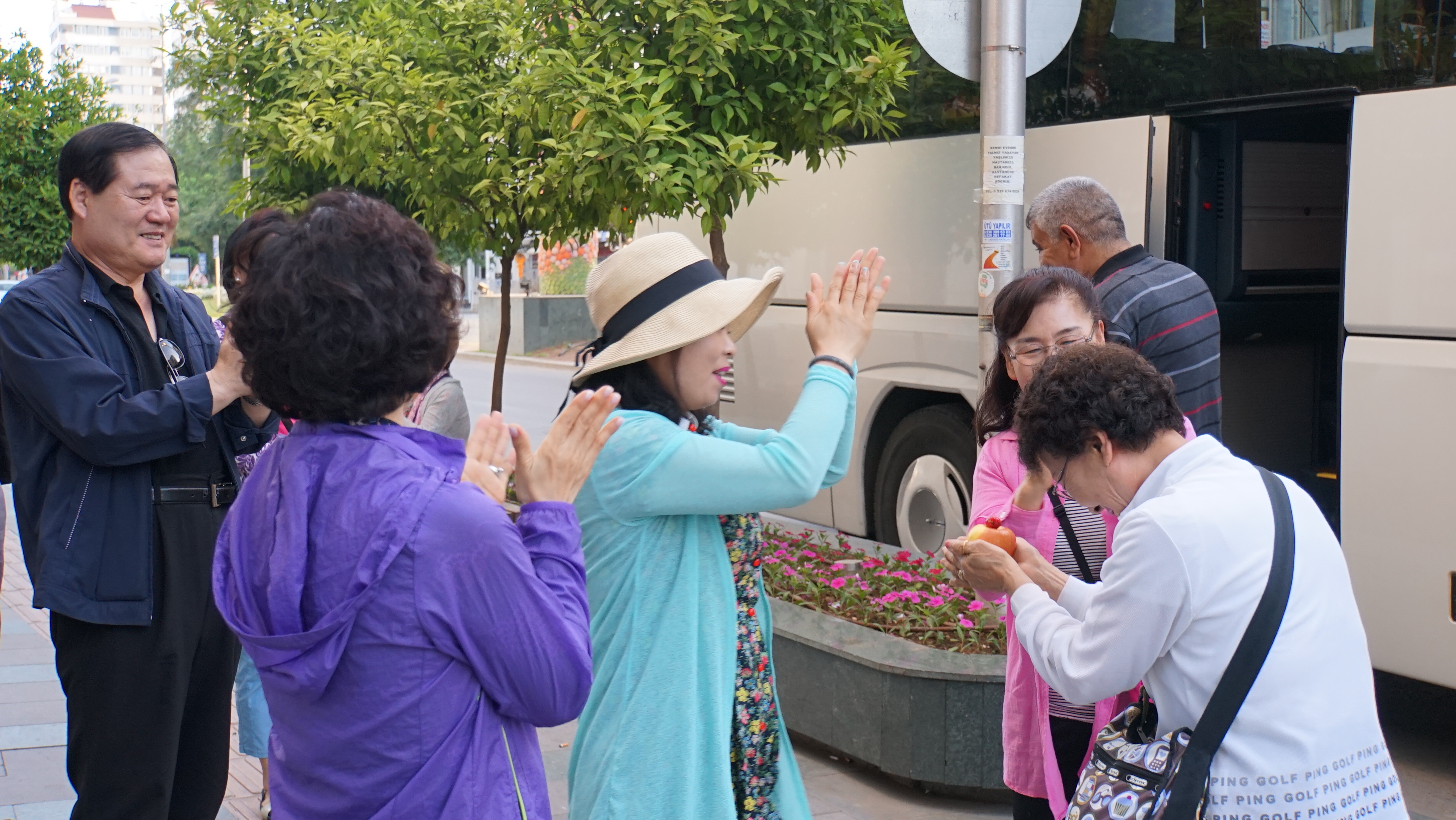 바닷가로 가지 전 버스를 타려고 기다리면서 일행들이 사과 위에 체리하나를 얹어서 생일케이크를 만들어 생일축하노래를 부