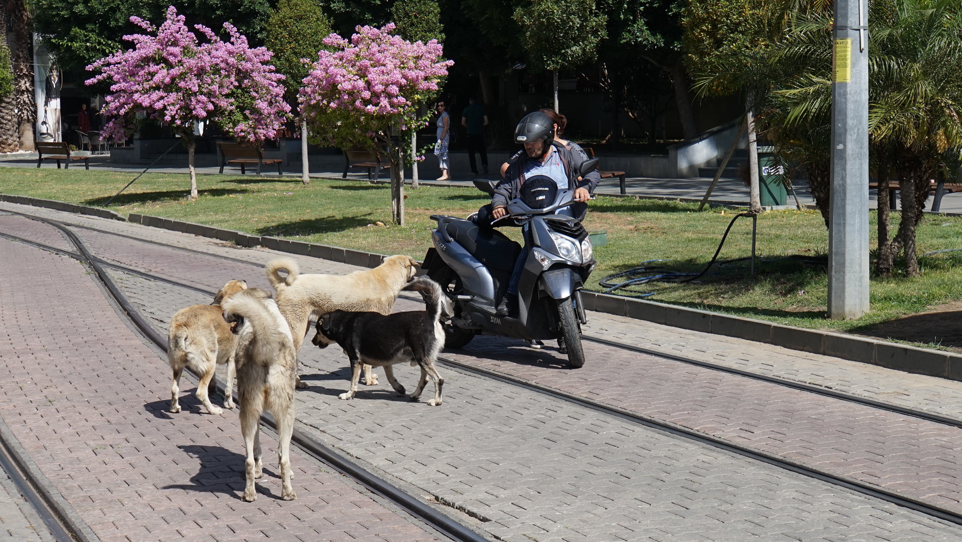 오토바이가 지나가는데 시비를 거는 개들....개들이 순하지만 차나 오토바이가 달려가면 결사적으로 달려든다고 한다....친구가